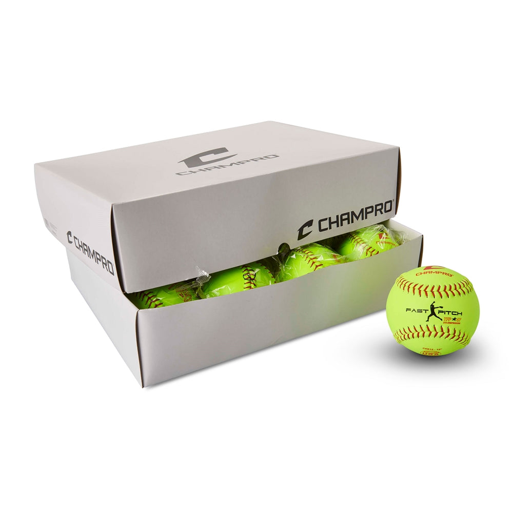This ASA/USA certified 12-inch fast pitch softball delivers tournament-grade performance with a solid polyurethane core engineered for consistent play. The optic yellow leather cover provides superior visibility and durability on the field, while the raised seam design enhances grip and control. With a .47 COR and 375 compression rating, this ball meets official league standards for competitive fast pitch softball. The red stitching adds classic style alongside reliable performance for serious athletes and competitive teams.